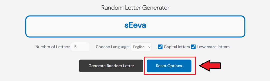 Want to change everything and start over? Click Reset Options to clear all fields. It resets the letter count, language, and case selections so you can begin fresh.